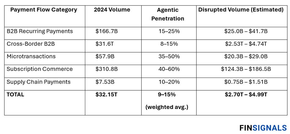 In the table below, I’ve estimated the potential volume of disrupted payments by applying an estimated agentic penetration rates to each category.